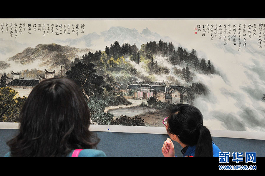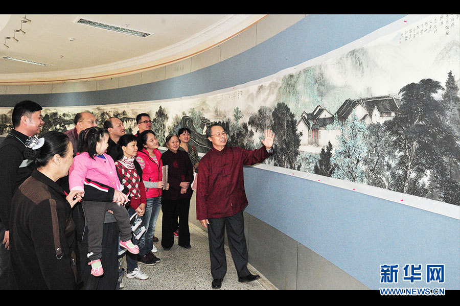 当日,迄今为止国内最大型国画山水长卷《中国客家村居图》亮相首届客家艺术节。该国画山水长卷全长339米、高0.96米,是中国美术家协会会员、客籍著名画家熊启雄教授花费十年时间创作的作品,作品由《闽西卷》、《梅州卷》和《赣南卷》三大部分组成。钟小丰摄