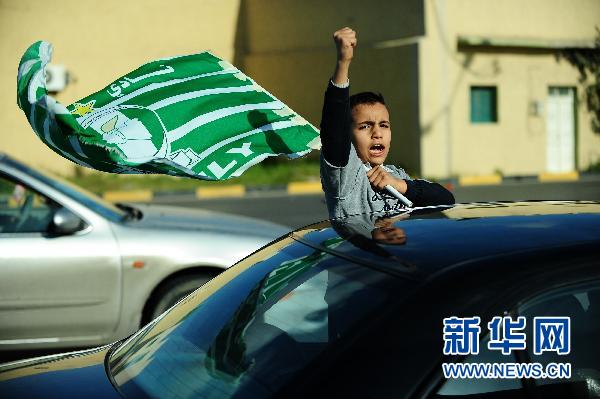 3月19日,在利比亚首都的黎波里总统府附近,一名当地儿童打着绿色旗帜支持卡扎菲。目前,虽然处于多国部队轰炸的威胁中,利比亚首都的黎波里生活较为平静。 新华社记者杨光摄