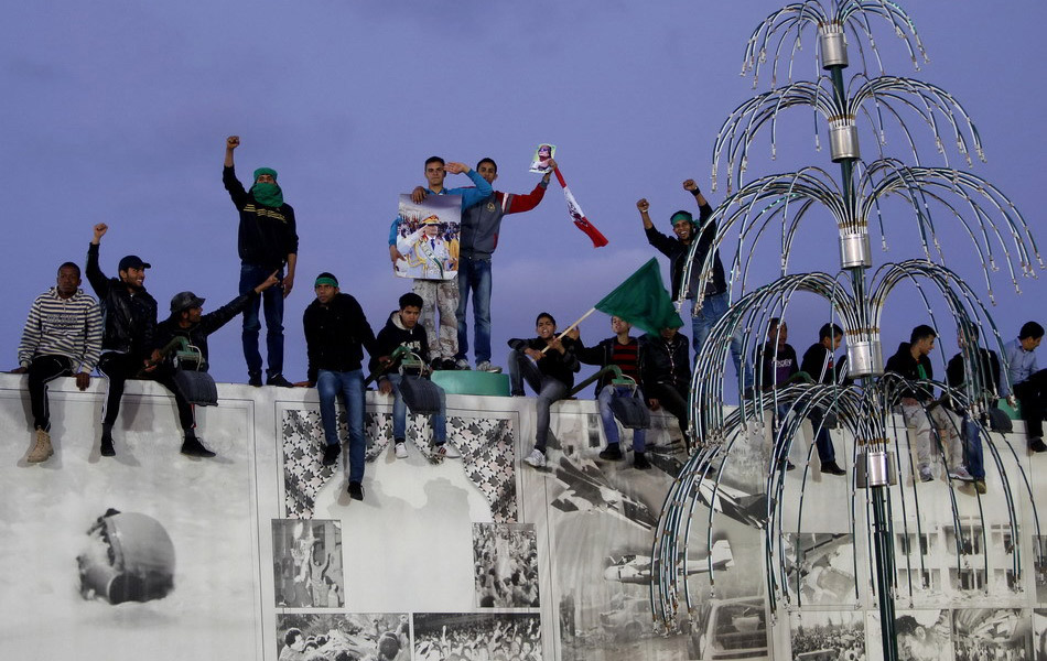 2011年3月19日,利比亚首都的黎波里,总统卡扎菲的支持者在卡扎菲官邸组成人肉盾牌防止多国联军轰炸。