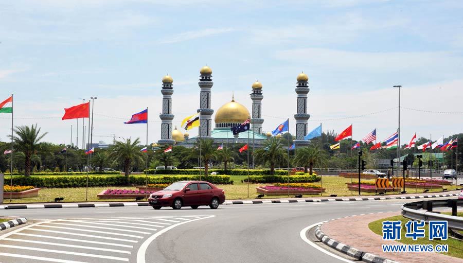 2013年10月7日 (国际)文莱准备迎接第23届东盟峰会及系列峰会 10月6日,文莱首都斯里巴加湾市街道两边悬挂着东盟及对话伙伴国的旗帜。第23届东盟峰会及系列峰会将于10月9日至10日在文莱首都斯里巴加湾市举行。新华社发(杰弗里摄)