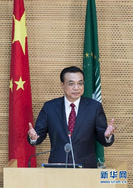 5月5日,中国国务院总理李克强在位于亚的斯亚贝巴的非洲联盟总部发表题为《开创中非合作更加美好的未来》的演讲。 新华社记者 王晔 摄