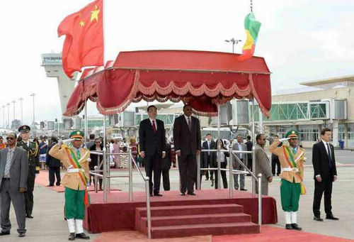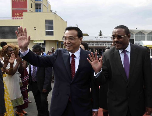 中新网亚的斯亚贝巴5月6日电(记者 郭金超)当地时间6日下午,中国国务院总理李克强结束对埃塞俄比亚和非盟总部的访问,乘专机离开亚的斯亚贝巴飞赴此访非洲的第二站尼日利亚。埃塞总理海尔马里亚姆和夫人到机场欢送,并举行了欢送仪式。身着民族服装的当地民众载歌载舞欢送中国贵宾。