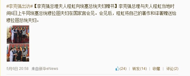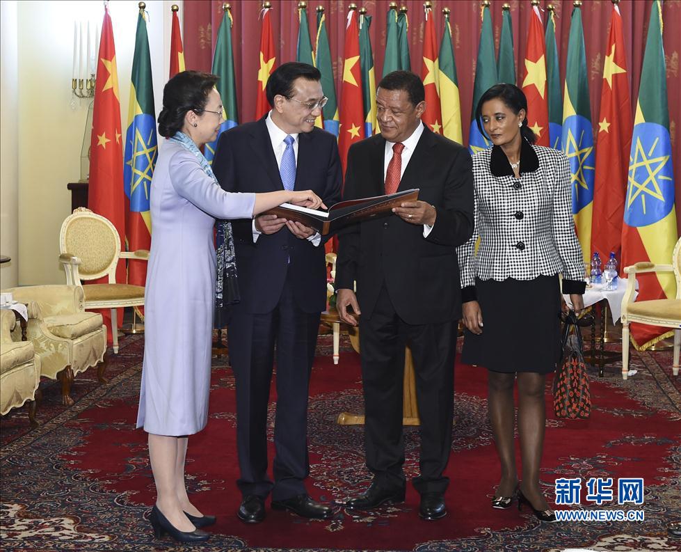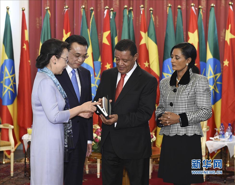 5月6日,中国国务院总理李克强在亚的斯亚贝巴国家宫会见埃塞俄比亚总统穆拉图。 李克强总理夫人程虹、穆拉图总统夫人梅阿扎参加会见。这是会见结束后,李克强总理夫人程虹向穆拉图总统夫妇赠送她的著作。 新华社记者李学仁摄"