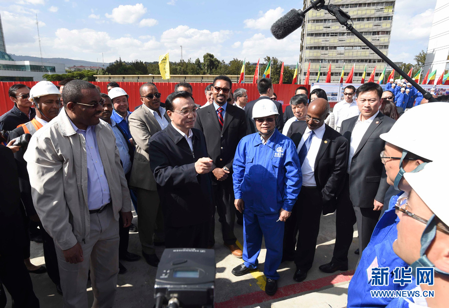 5月5日,中国国务院总理李克强考察亚的斯亚贝巴轻轨项目,埃塞俄比亚总理海尔马里亚姆陪同。这是李克强与海尔马里亚姆看望施工人员。新华社记者李学仁摄