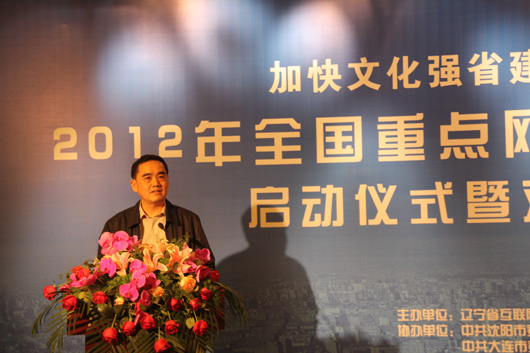 2012年全国重点网络媒体辽宁行6月3日晚在沈阳启动,图为辽宁省委宣传部副部长、辽宁省网信专职副主任孟繁华在启动仪式上致辞(中国台湾网 王文英 摄)
