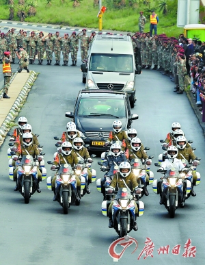 在曼德拉遗体运往联邦大厦的途中,身穿迷彩服和带着酒红色贝雷帽的执勤士兵站在两旁。路两旁还有专程从南非各地赶来的、挥舞着旗帜送别这位伟人的民众。