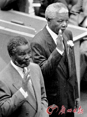 1994年5月9日,曼德拉(右)在南非国民议会上宣誓就任总统。 (资料图片)
