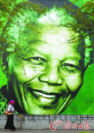 在南非比勒陀利亚的大街上,一面墙上挂着曼德拉的肖像。