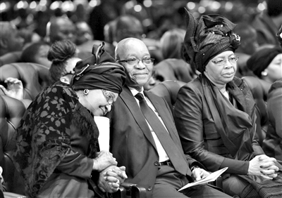 曼德拉前妻温妮(左)、南非总统祖马(中)和曼德拉遗孀格拉萨(右)出席曼德拉葬礼仪式。