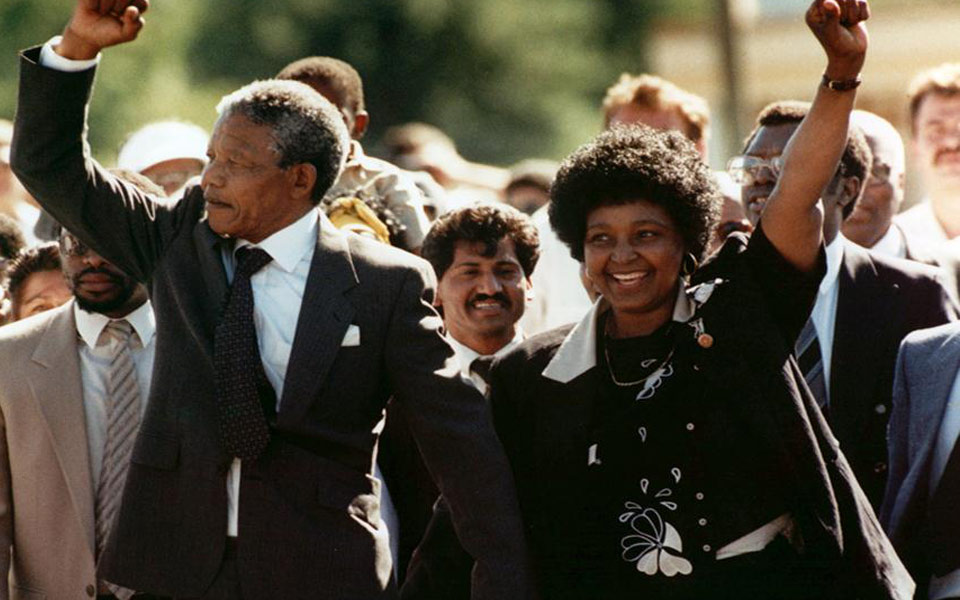 即使是在极其艰难的监狱生活中,曼德拉也依然保持着高昂的斗志。长期恶劣的斗争和监禁生活并没有摧毁他的身躯和意志,反而使他政治上更加成熟,观察问题更加周全,人格魅力得到了升华。1990年2月11日,南非当局在国内外舆论压力下,被迫宣布无条件释放曼德拉。图为曼德拉在获释后和妻子温妮携手向支持者致意。