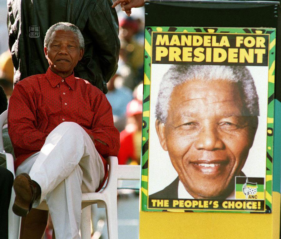 1994年4月23日,非国大主席曼德拉坐在自己南非总统竞选海报旁边。