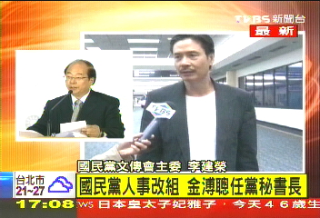 国民党文传会主委李建荣:“年底之前,有一个重要的人事案,为了因应党内的工作需要,本党副主席兼中央委员会秘书长詹春柏同志,免兼秘书长职,并改任专职副主席,所以原秘书长职缺,通过由金溥聪同志担任。”