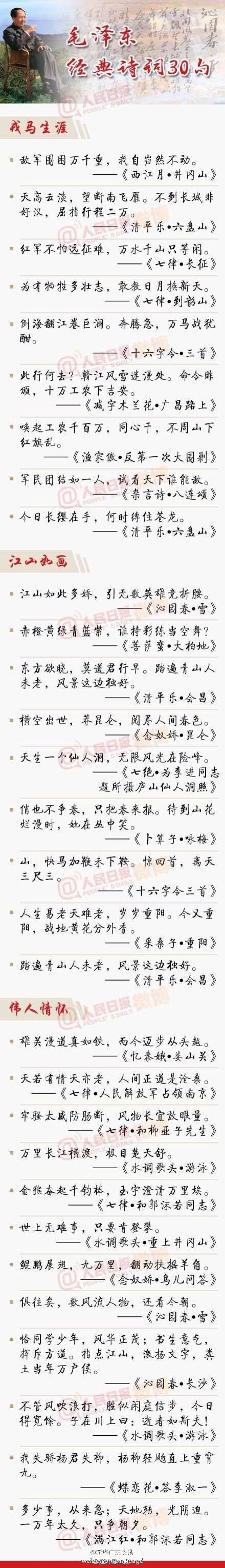 【毛泽东诞辰120周年 重温毛泽东经典诗词】①敌军围困万千重,我自岿然不动;②今日长缨在手,何时缚住长龙;③江山如此多娇,引无数英雄竞折腰;④踏遍青山人未老,风景这边独好;⑤俏也不争春,只把春来报。待到山花烂漫时,她在丛中笑。⑥雄关漫道真如铁,而今迈步从头越;⑦一万年太久,只争朝夕。