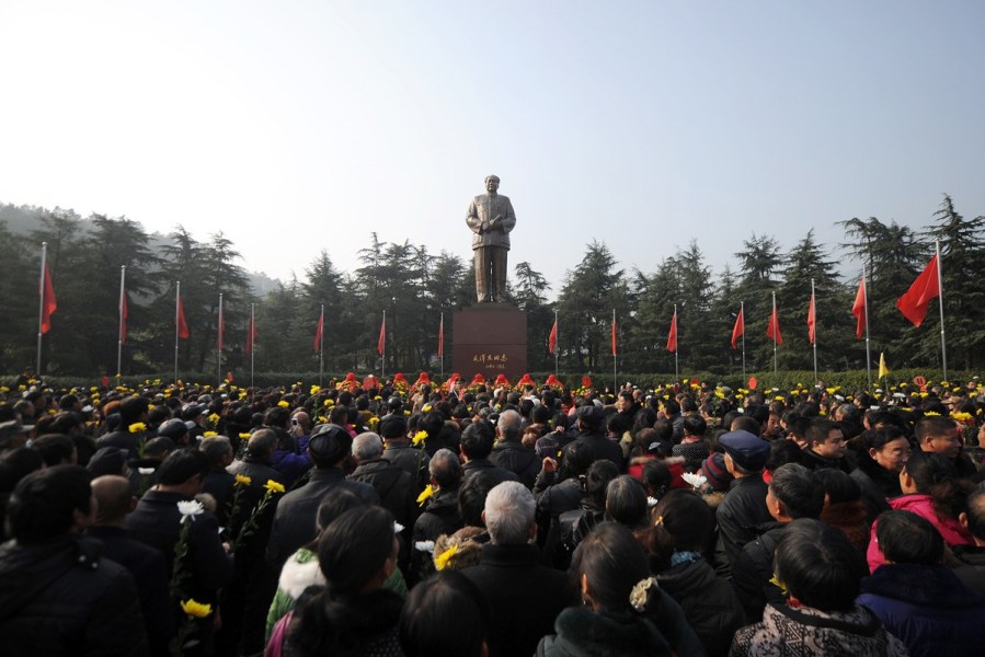 12月24日,中国民众,毛泽东亲属在韶山向毛泽东同志铜像敬献花篮,纪念毛泽东同志诞辰120周年。