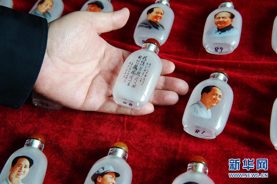 10月16日,张汝财在展示套壶上的毛泽东诗词。在中国“内画艺术之乡”衡水,中国工艺美术大师张汝财带领六名高级工艺美术师耗时三年,完成了120幅毛泽东肖像内画系列套壶,以纪念毛泽东主席诞辰120周年。该套内画创意新颖、雕琢精湛、绘画传神,据了解,每一幅内画都需要一名高级工艺美术师花费一个多星期的时间来创作。新华社发(牟宇 摄)