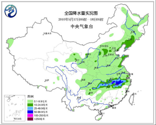图1 全国降水量实况图(2010年5月17日05时~18日05时)