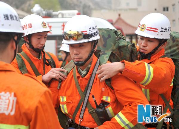 4月14日,消防官兵在做出发准备。当日,甘肃省救援总队120名消防官兵离开兰州,奔赴青海玉树地震灾区,参与地震救援。 新华社记者 聂建江 摄