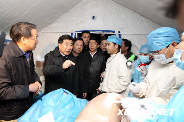 4月14日,受胡锦涛总书记、温家宝总理委托,中共中央政治局委员、国务院副总理、国务院抗震救灾总指挥部总指挥回良玉率指挥部成员单位负责人赶赴青海玉树地震灾区慰问受灾群众,指导抗震救灾工作。这是刚刚抵达青海玉树地震灾区的回良玉在临时帐篷医院看望慰问伤员和医护人员。新华社记者 丁林 摄