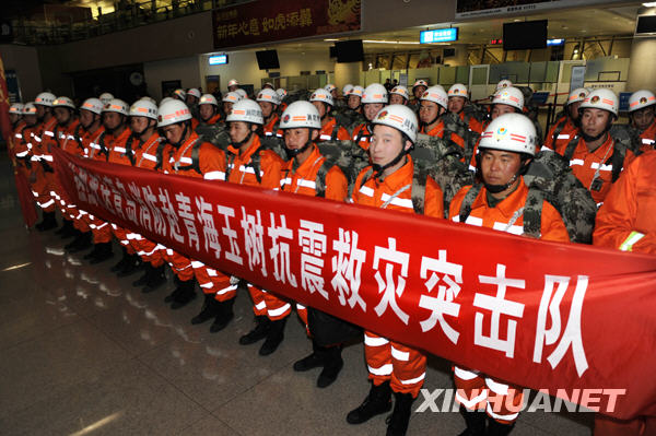 4月15日凌晨,救援队官兵在青岛流亭机场集结,准备奔赴玉树地震灾区。4月15日零点55分,青岛公安消防支队救援队一行62人乘坐山东航空公司SC903包机紧急奔赴玉树地震灾区,开展抗震救援行动。新华社记者李紫恒摄