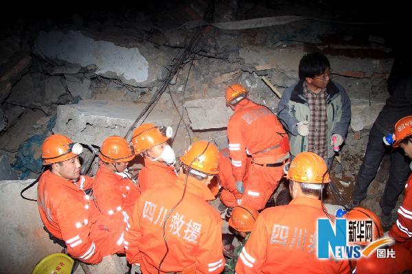 4月14日夜,四川救援队在玉树县县城红卫路一处地震废墟展开救援。当日19时44分,四川救援队抵达青海玉树机场后,随即赶赴救援现场,连夜投入救援工作。 新华社记者 任晓刚摄