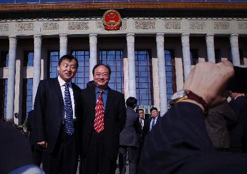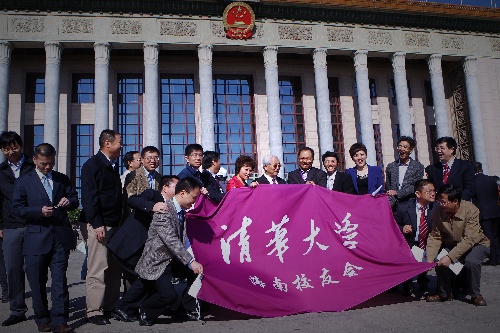 北京,2011年4月24日 百年清华缘 北京再聚首 4月24日,清华大学海南校友会的校友在北京人民大会堂前拍照留念。 当日,清华大学建校100周年大会在北京人民大会堂举行。 新华社记者 邢广利摄