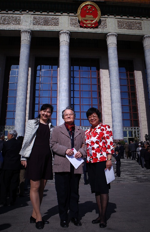 北京,2011年4月24日 百年清华缘 北京再聚首 4月24日,清华大学外语系原系主任程慕胜(中)、清华大学教师樊富珉(右)和张文霞在人民大会堂前拍照留念。 当日,清华大学建校100周年大会在北京人民大会堂举行。 新华社记者 邢广利摄