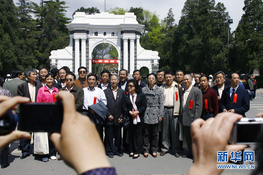 4月24日,校庆日返校的老校友们在清华二校门前合影留念。
