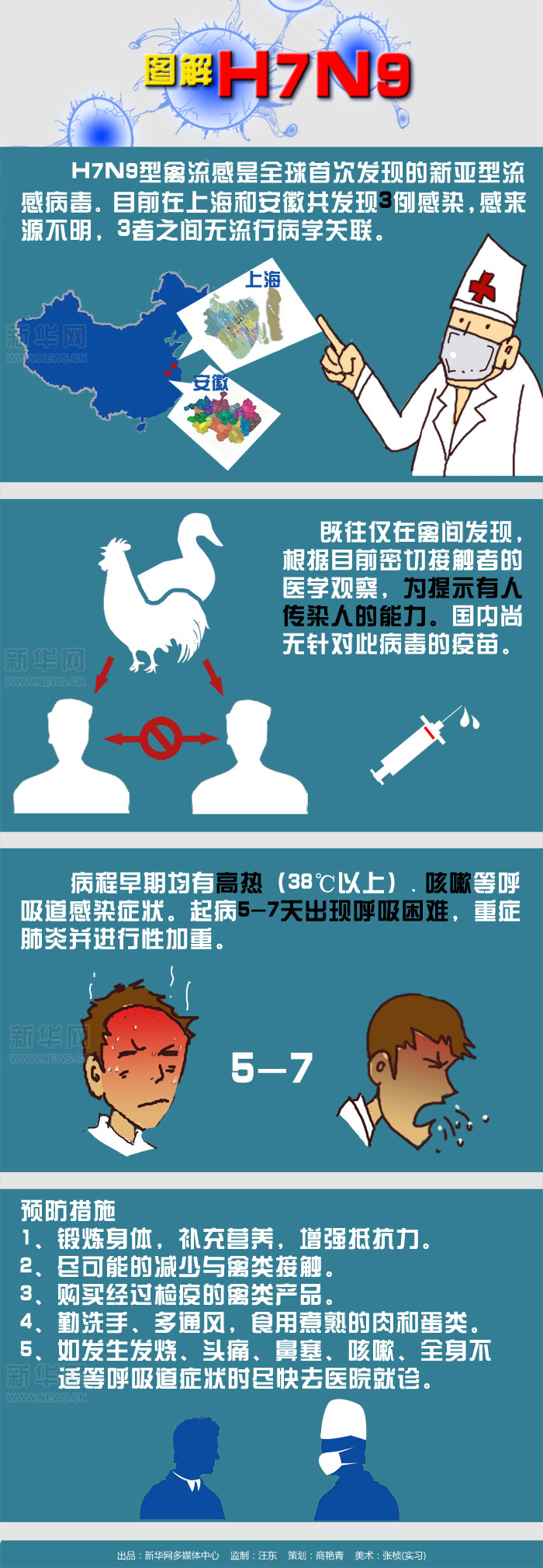 H7N9型禽流感是一种新型禽流感,于2013年3月底在上海和安徽两地率先发现。H7N9型禽流感是全球首次发现的新亚型流感病毒,尚未纳入我国法定报告传染病监测报告系统,并且至2013年4月初尚未有疫苗推出。被该病毒感染均在早期出现发热等症状,至2013年4月尚未证实此类病毒是否具有人传染人的特性,上海2名患者抢救无效死亡,安徽滁州1名患者正在南京抢救中。(文字来源;百度百科)