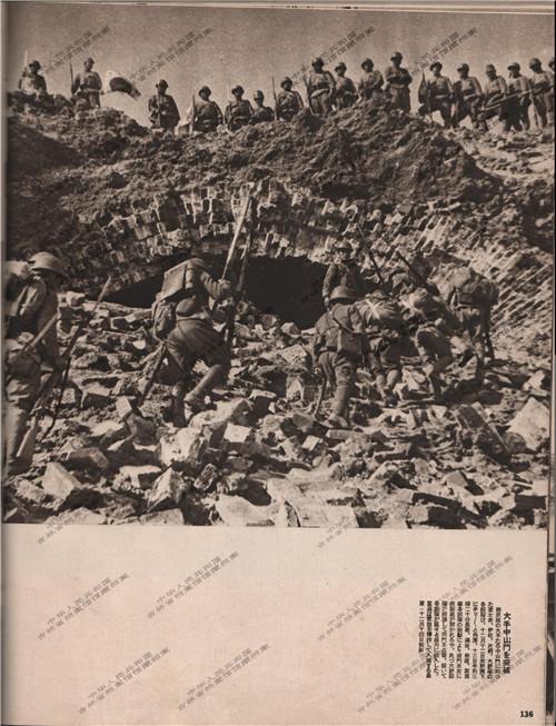 此图出自朝日新闻社发行的支那事变写真全集(中)上海战线,为南京攻略战的图片。日军各部队1937年12月12日在敌人的枪林弹雨下逐渐逼近南京正门中山门,13日上午3点20分,炮轰袭击后在城门左右开辟了突击路线。首先大野部队突击占领中山门,接下来各部队陆续冲入城内,该照片为挥舞军旗入城的皇军。