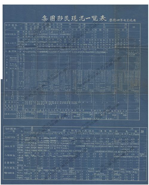 从1932年10月第一次武装移民团开始,日本先后进行的6次“集团移民”。馆藏中的一张集团移民现状一览表体现出从第一次到第六次日本集团移民的分布、数量、现状等(其中包括弥荣村、千镇村等移民的地理位置、指导员关系、入殖关系、营农关系、农产加工、户数、教育、卫生、交通等方面都做了较详尽的统计)。