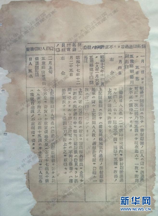 这是1943年哈尔滨宪兵队《思想对策月报(第三号)》中的一份文件,该文件记载了五常县朝阳川“开拓团”打着“收买”的旗号夺占东北农民土地、欺压百姓的情况(4月23日摄)。针对吉林省档案馆新发掘的一批日军侵华档案,由国内专家组成的工作组近日进行了审辨工作。专家认为,这批档案为揭露日本侵略罪行增添了新的铁证。据介绍,吉林省档案馆现存日本侵华档案65个全宗、近10万卷(件),其中绝大部分是日本侵华过程中自己形成的档案,真实记录和反映了日本侵华的各种罪恶活动,为揭露日本侵华战争的罪恶本质提供了大量确凿可信的历史证据。据吉林省档案馆馆长尹怀介绍,目前已经发掘的89件档案只是馆藏档案的冰山一角,随着翻译、整理工作的继续进行,还会有更多揭露日本侵略罪行的档案被发掘。新华社记者 林宏 摄