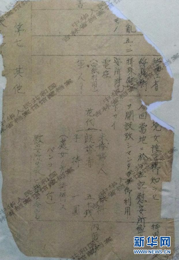 这是鸡宁临时宪兵队《思想对策月报》的一页,文件记载了在牡丹江省绥阳街军队特殊“慰安所”附近电线杆上,张贴有用白纸书写的招募“慰安妇”广告(4月23日摄)。针对吉林省档案馆新发掘的一批日军侵华档案,由国内专家组成的工作组近日进行了审辨工作。专家认为,这批档案为揭露日本侵略罪行增添了新的铁证。据介绍,吉林省档案馆现存日本侵华档案65个全宗、近10万卷(件),其中绝大部分是日本侵华过程中自己形成的档案,真实记录和反映了日本侵华的各种罪恶活动,为揭露日本侵华战争的罪恶本质提供了大量确凿可信的历史证据。据吉林省档案馆馆长尹怀介绍,目前已经发掘的89件档案只是馆藏档案的冰山一角,随着翻译、整理工作的继续进行,还会有更多揭露日本侵略罪行的档案被发掘。新华社记者 林宏 摄