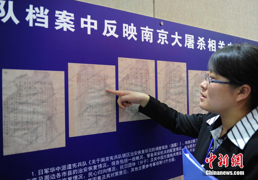 近日,吉林省档案馆公布了一批新整理、发掘的日本侵华档案,包括关东宪兵队司令部档案87件,伪满中央银行档案2件。档案共分八个方面:南京大屠杀、强征“慰安妇”、731部队“特别移送”、残酷奴役劳工、日军暴行、对中国东北实施移民侵略、镇压东北抗日联军、审讯和虐待英美战俘。图为吉林省档案馆工作人员在介绍日本侵华档案内容。张瑶 摄