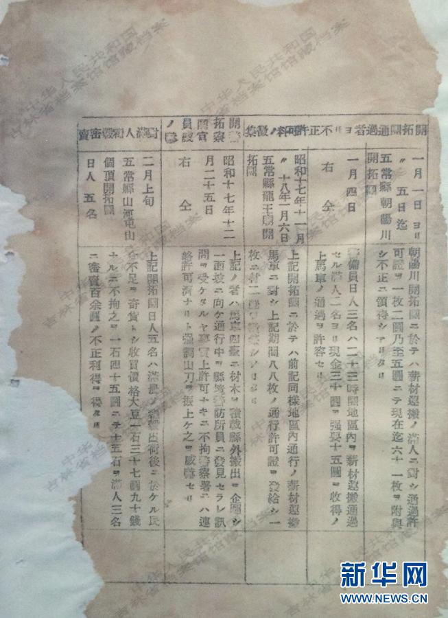 这是哈尔滨宪兵队《思想对策月报(第三号)》档案文件的扫描件(4月22日摄)。吉林省档案馆新发掘的一批档案资料显示,日本侵略者曾大规模向中国东北进行移民侵略活动,并在移民过程中掠夺土地和各类资源,欺压中国东北地区百姓,企图达到永久统治中国东北的目的。此次公布的10件反映日本移民侵略的档案资料,涵盖了日本移民夺占东北农民土地、欺压东北农民等方面内容,通过文字、图表等揭示了日本曾向中国东北多次进行大规模殖民侵略的罪恶行径。新华社记者林宏摄