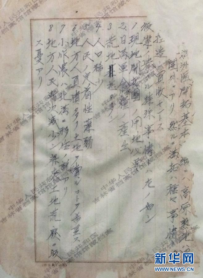 这是关东宪兵队司令部《关于收买土地引起中国人地主反对情况的通牒》档案文件的扫描件(4月22日摄)。吉林省档案馆新发掘的一批档案资料显示,日本侵略者曾大规模向中国东北进行移民侵略活动,并在移民过程中掠夺土地和各类资源,欺压中国东北地区百姓,企图达到永久统治中国东北的目的。此次公布的10件反映日本移民侵略的档案资料,涵盖了日本移民夺占东北农民土地、欺压东北农民等方面内容,通过文字、图表等揭示了日本曾向中国东北多次进行大规模殖民侵略的罪恶行径。新华社记者林宏摄