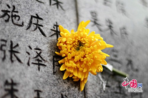 2014年4月5日,江苏省南京市,人们将菊花粘贴在侵华日军南京大屠杀遇难同胞纪念馆遇难者名单上。中国网图片库董金林 摄影