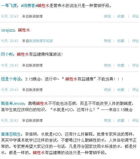 2010年3月15日晚,央视315晚会曝光了碱性“神奇”水,这些热销的“碱性水”改善人体PH值谎言。接受采访的专家更指出,细菌的理想生活环境即是碱性的,按碱性水的宣传来看,喝了碱性水更有助于细菌繁衍。 。这些碱性水声称有奇妙功能,改变身体酸性体质。专家指出,人的体液的pH值大概在7.4左右,如果靠碱性水使人体环境偏碱性,反而对人体有害。晚会直播期间,记者在新浪微薄平台看到众多网友谴责这种带有误导性的营销手段以及不负责任的宣传。