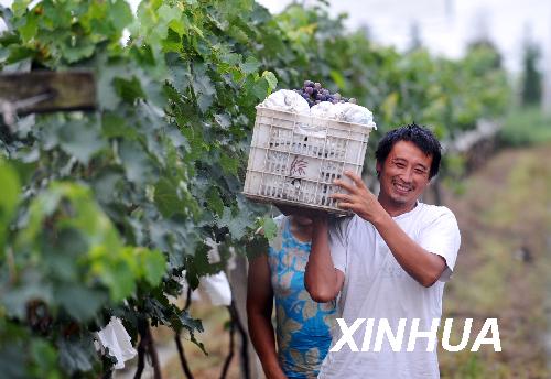 7月17日,小岗村村民缪夕清在搬运葡萄。近两年来,安徽省凤阳县小岗村在有关专家的带动下,通过土地整合,发展特色经济,仅葡萄种植就达600亩,每户每年提高收入2000多元。新华社记者 王雷 摄