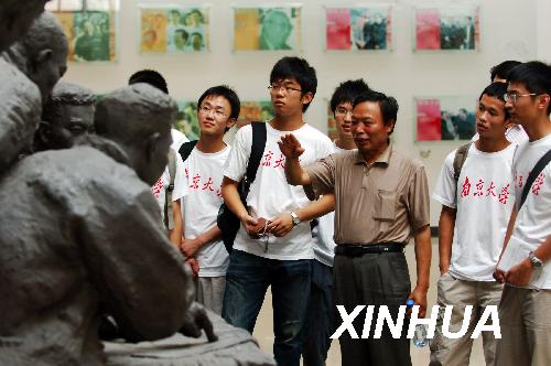 7月17日,南京大学工程管理学院的师生在与大包干带头人之一严宏昌(前右三)交流。今年正值改革开放三十年,大包干发源地——安徽省凤阳县小岗村成为大学生暑期社会实践的热土。全国许多高校师生来到小岗村,走访大包干带头人,考察小岗村三十年来的发展变化,增加对改革开放三十年的认识。新华社记者 李健 摄
