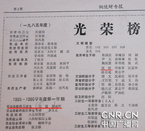 沈浩在上学期间所取得的成绩,当时已经改名。(中广网 陈晓冉摄)