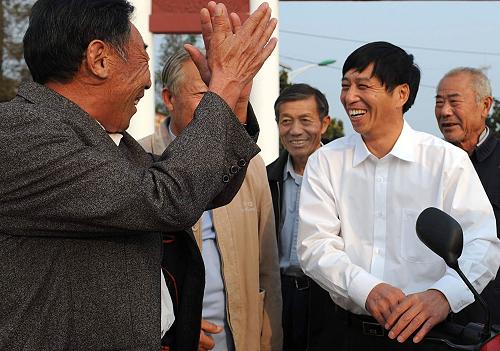 这是2008年10月7日,小岗村新带头人、村党委书记沈浩(前右)与大包干带头人关友江、严俊昌、严金昌、严学昌交流小岗村的改革发展情况。新华社记者 王雷 摄