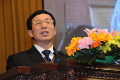 1月13日下午3时,沈浩同志先进事迹报告会在人民大会堂举行,图为沈浩哥哥、安徽萧县杨楼镇人大主席沈明儒作报告。新华网 李清 摄