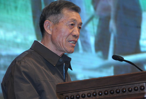 1月13日下午3时,沈浩同志先进事迹报告会在人民大会堂举行,图为安徽凤阳县小岗村村民、“大包干”带头人之一严金昌作报告。新华网 李清 摄
