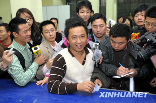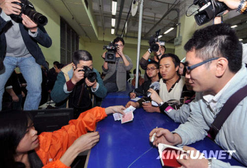 1月21日,广州流花展馆春运火车票集中售取票点迎来第一位取实名制火车票的旅客,外来务工人员李建刚(前中)和他表弟刘超当天一早通过电话订到广州至资阳的火车票。(图片来源:新华社 刘大伟 摄)