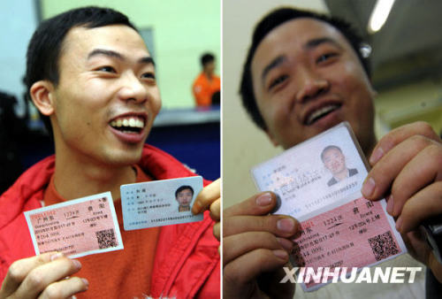 1月21日,外来务工人员李建刚(右图)和他表弟刘超(左图)通过电话订票买到广州至资阳的实名制火车票。(图片来源:新华社 刘大伟 摄)