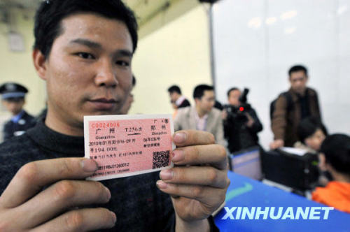 1月21日,一名旅客在广州流花展馆展示自己当天早上通过电话订到的广州至郑州的实名制火车票。(图片来源:新华社 刘大伟 摄)
