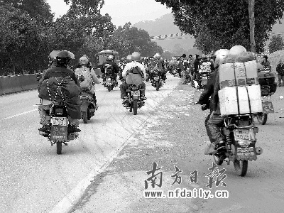 戴上头盔、披上雨衣、载上家人,回家过年。春节临近,由佛山、东莞、广州等珠三角城市返乡农民工组成的10万“摩托车返乡大军”,沿着321国道返回广西、贵州、湖南和四川老家过年。他们穿着厚实的棉衣,结实的绑腿,棉质护膝,防风头盔,皮手套,或成群结队,或独马单骑,车上大多数是小两口子,或者夹带一个小孩,奔驰在国道上,成了春运交通线上一道道特殊的风景。