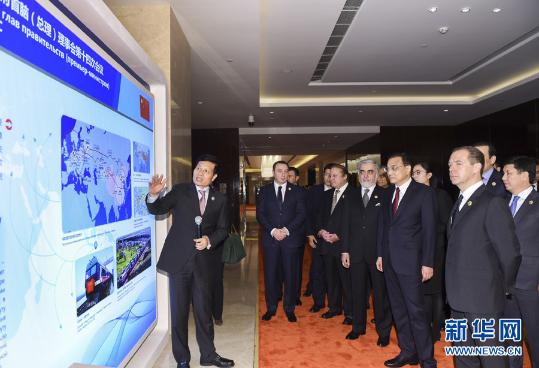 12月14日,国务院总理李克强在河南郑州为来华出席上海合作组织成员国政府首脑(总理)理事会第十四次会议的各国领导人举行欢迎宴会。这是宴会前,李克强同与会各国领导人共同参观河南省同上合组织成员国合作成果展。新华社记者谢环驰摄