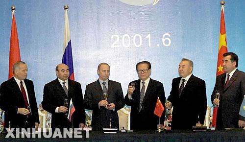 这是2001年6月15日,上海合作组织首次元首会议在上海举行,出席《上海合作组织成立宣言》和《打击恐怖主义、分裂主义和极端主义上海公约》签字仪式的与会国元首签字后举杯庆贺。 新华社发