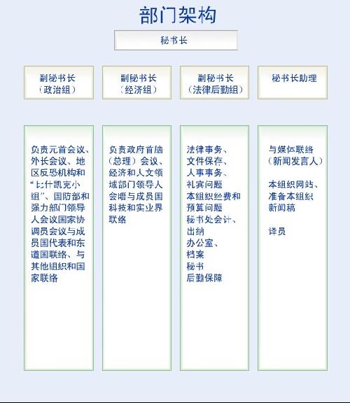 ●秘书处——上海合作组织常设行政机构,设在北京,2004年1月成立。主要职能是:为组织活动提供组织、技术保障;参与组织各机构文件的研究和落实;就编制组织年度预算提出建议。秘书长由元首会议任命,由各成员国按国名的俄文字母顺序轮流担任,任期三年,不得连任。首任秘书长为张德广。现任秘书长为哈萨克斯坦的博拉特·努尔加利耶夫,2007年1月1日就任。
